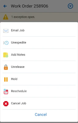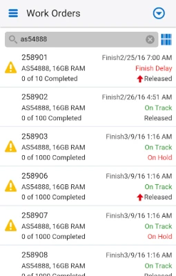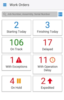 - Filter and search, or barcode scan work orders to view progress (on track, delayed, on hold, exceptions)